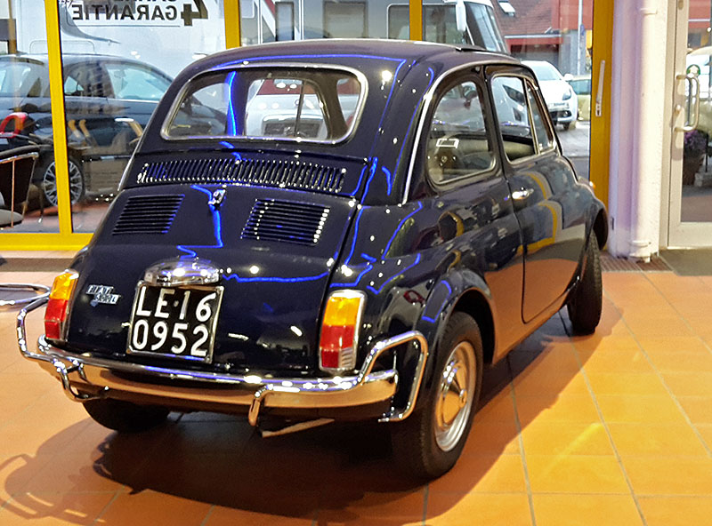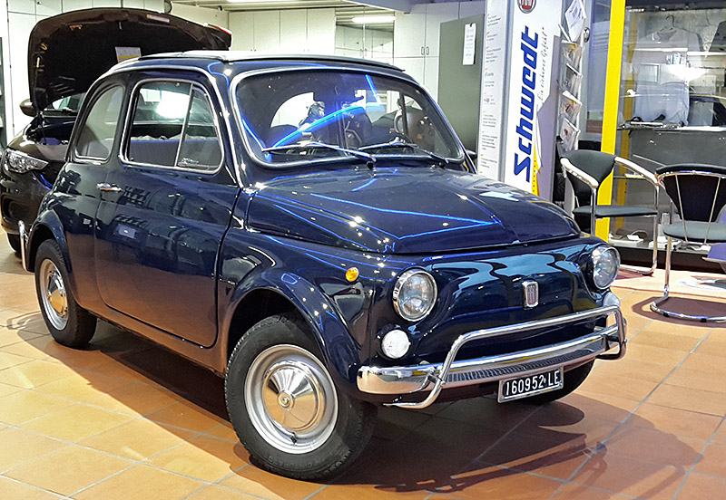 Als ich in in das Gebäude ging, sah ich im Ausstellungsraum einen niedlichen kleinen dunklelblauen 500 L aus den 70er Jahren.